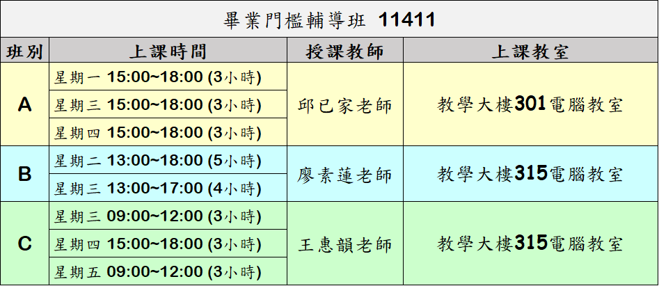 114學年度第1學期英文畢檻班(11411)上課時間與教室表